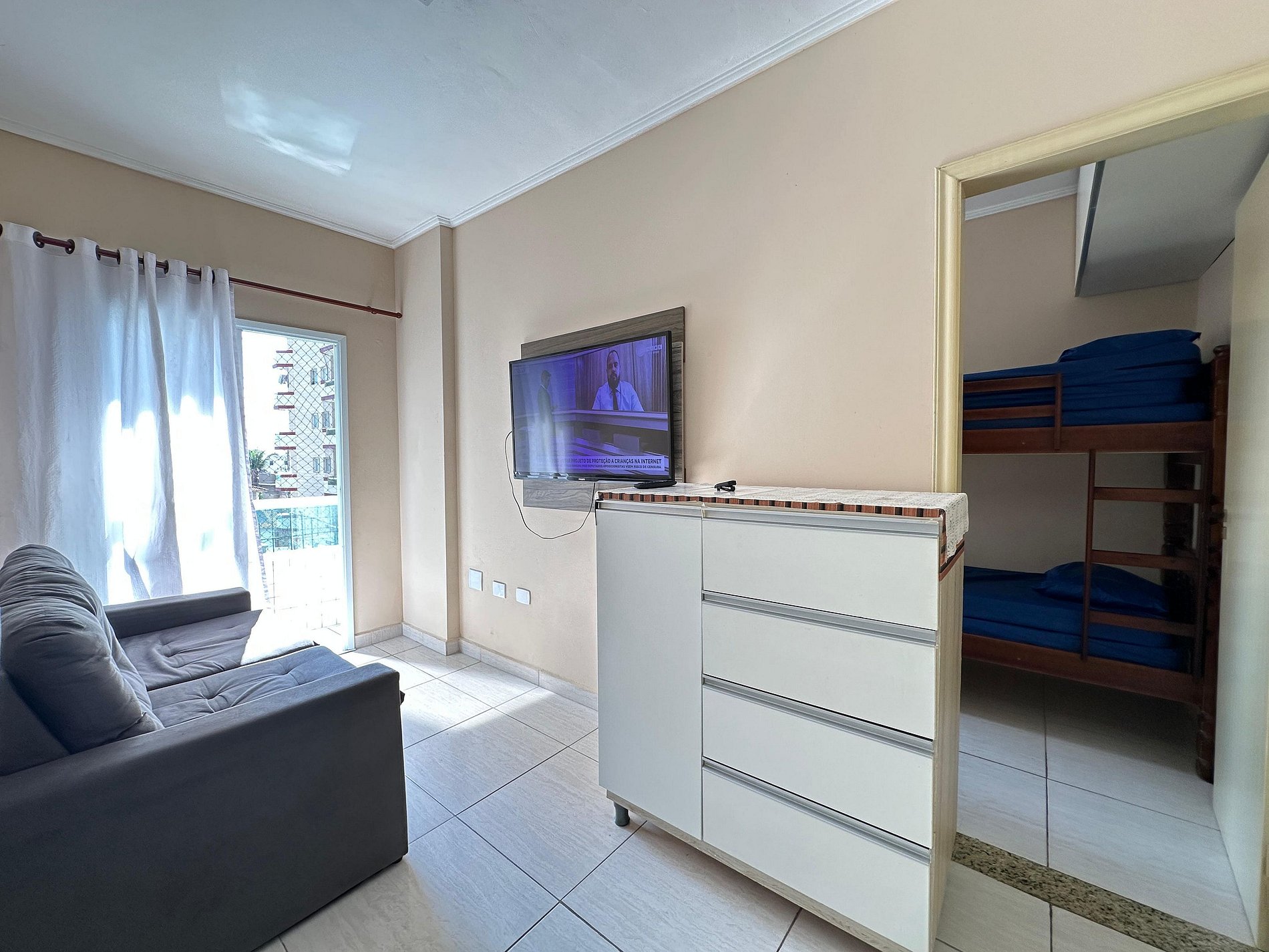 Aconchegante e bem localizado, com 1 dormitório com 1 cama de casal, 1 beliche e 1 colchão adicional, sala com sofá e tv, cozinha equipada com fogão, geladeira, mesa e 4 cadeiras, banheiro e área de serviço. Ideal para dias tranquilos na Praia da Mirim! Próximo a comércios, transporte e à linda orla da Praia Grande.