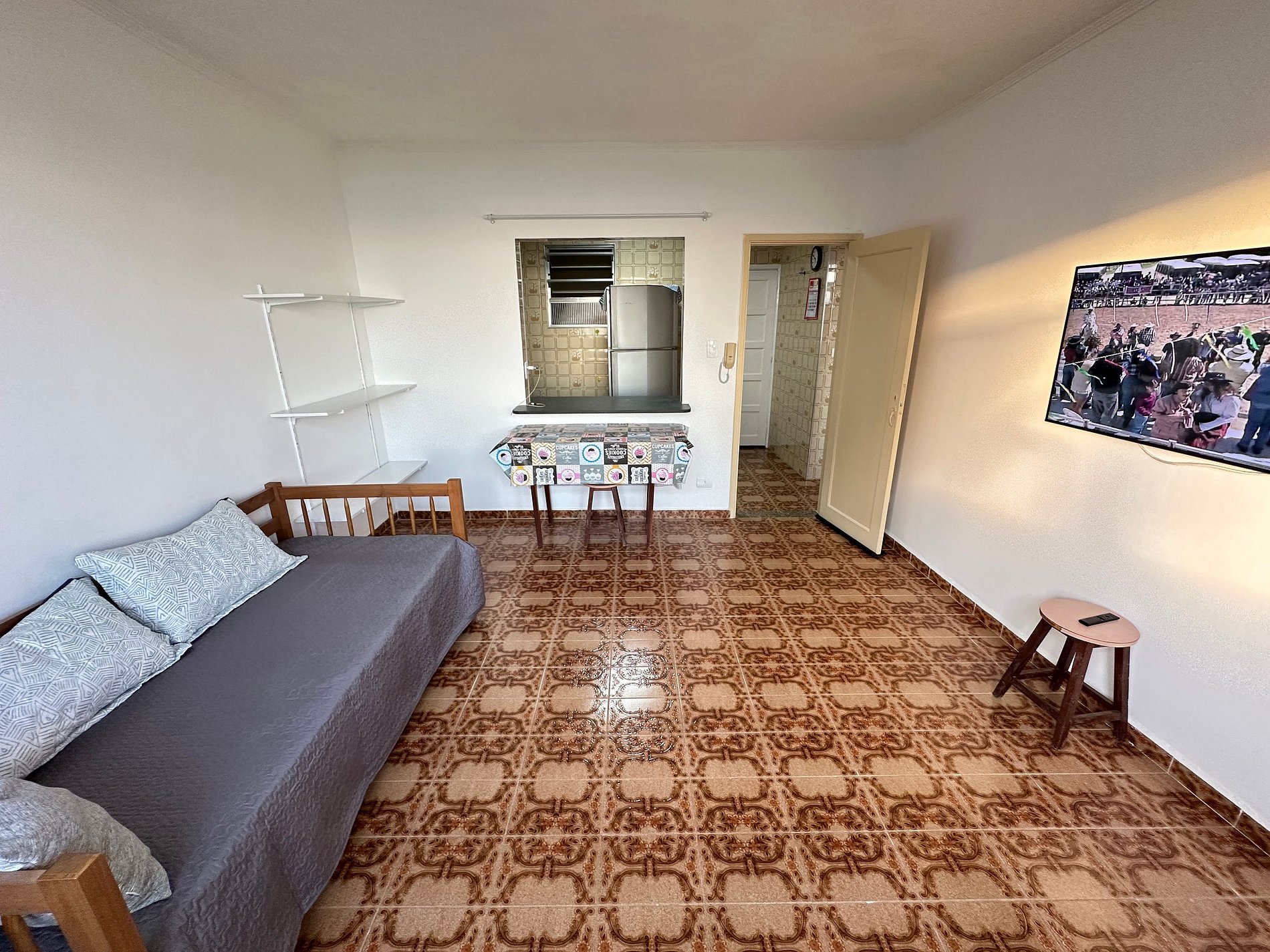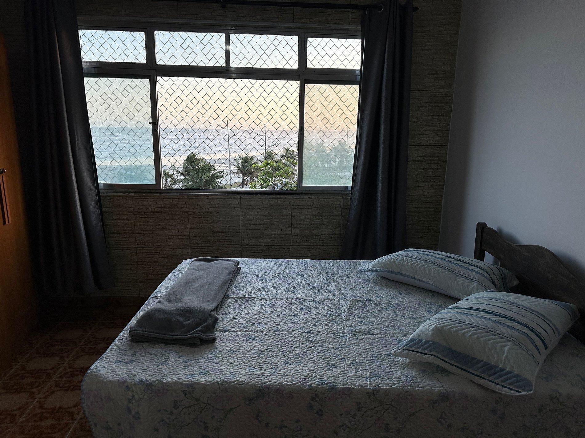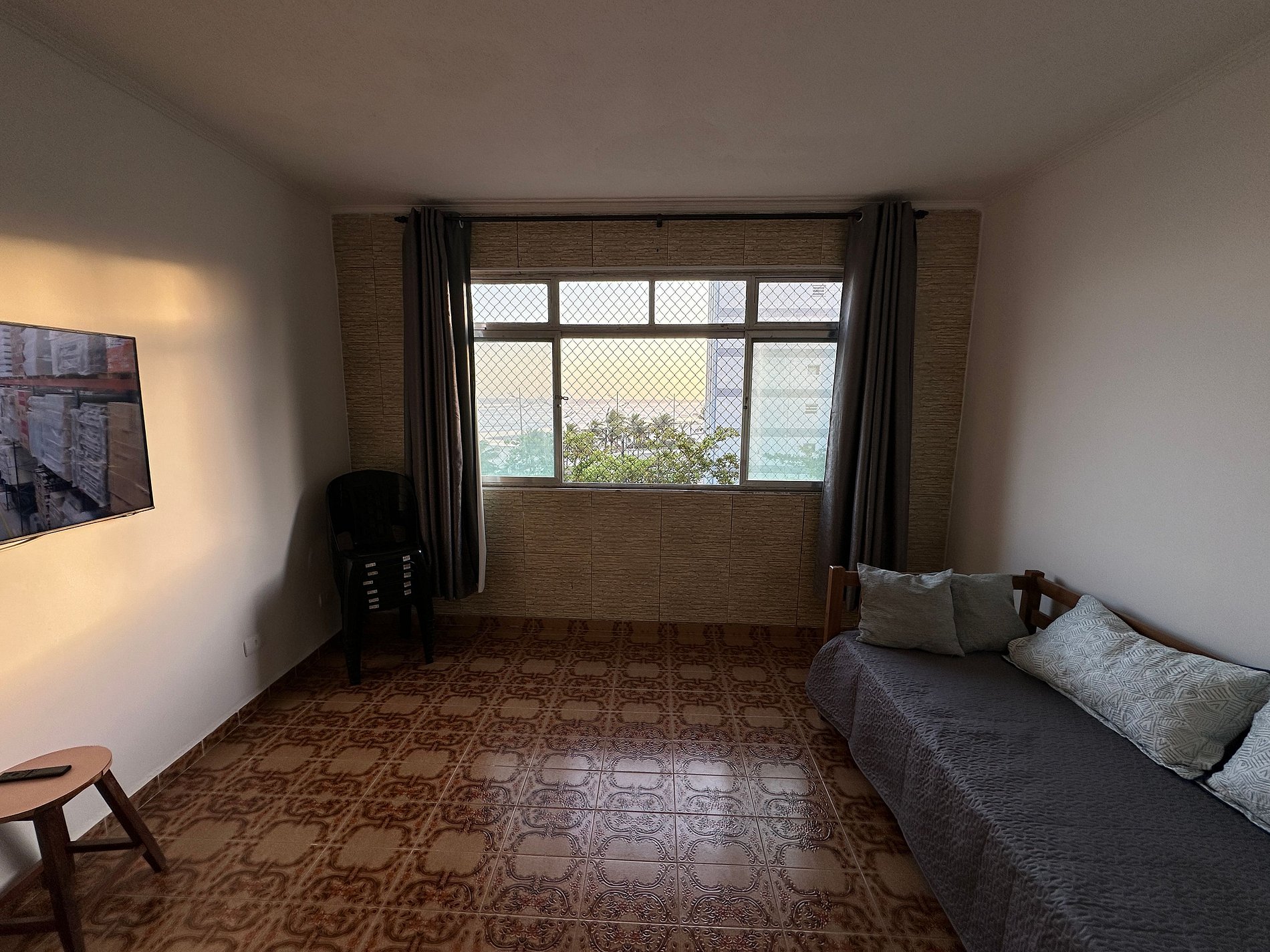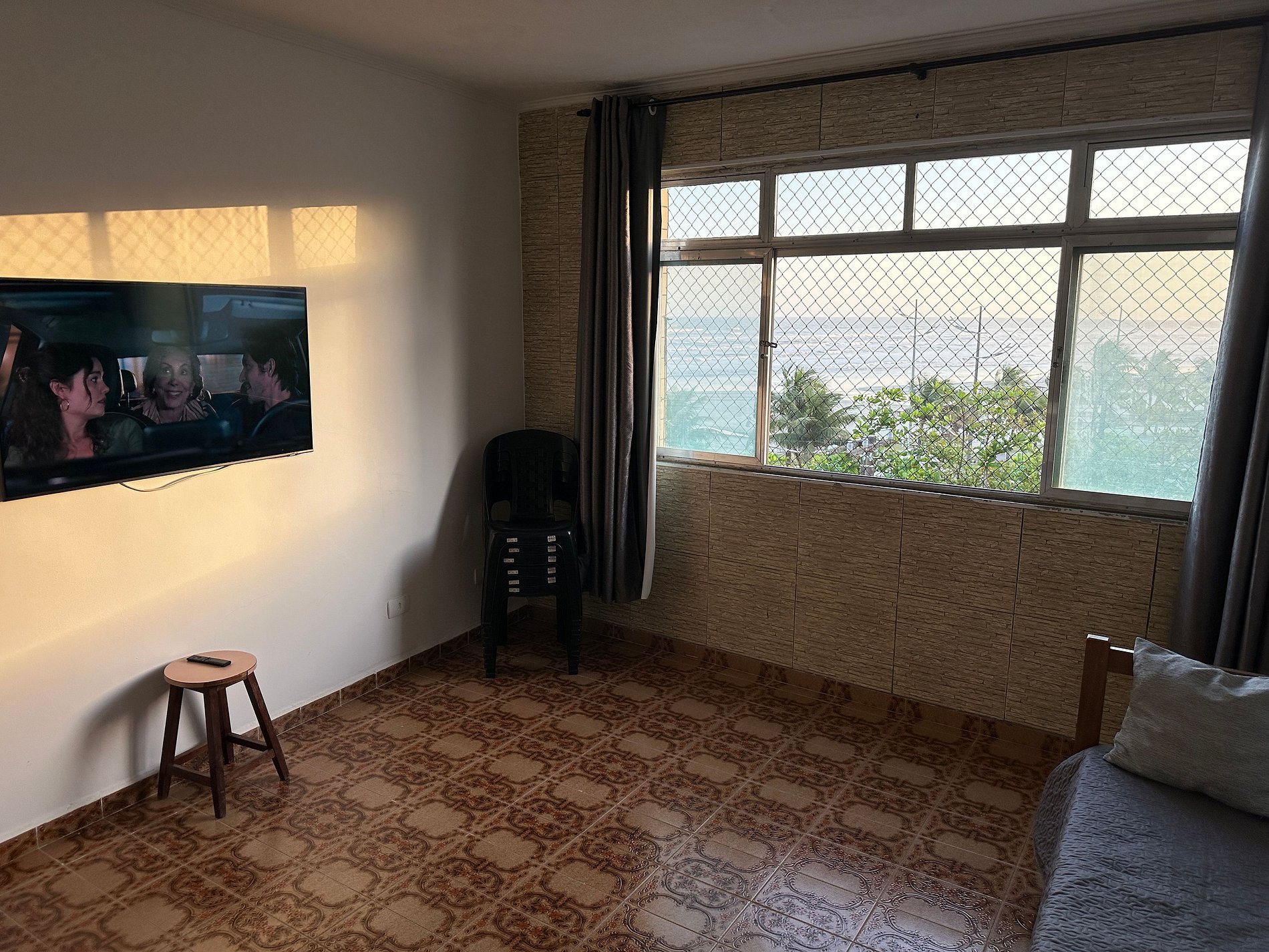 Apartamento frente mar, com uma vista encantadora da praia do Caiçara. Sala arejada com TV e espaço confortável para relaxar, cozinha equipada para preparar suas refeições e quarto aconchegante com boas opções de acomodação. Um ambiente simples, bem cuidado e acolhedor, perfeito para curtir o melhor da Praia Grande.