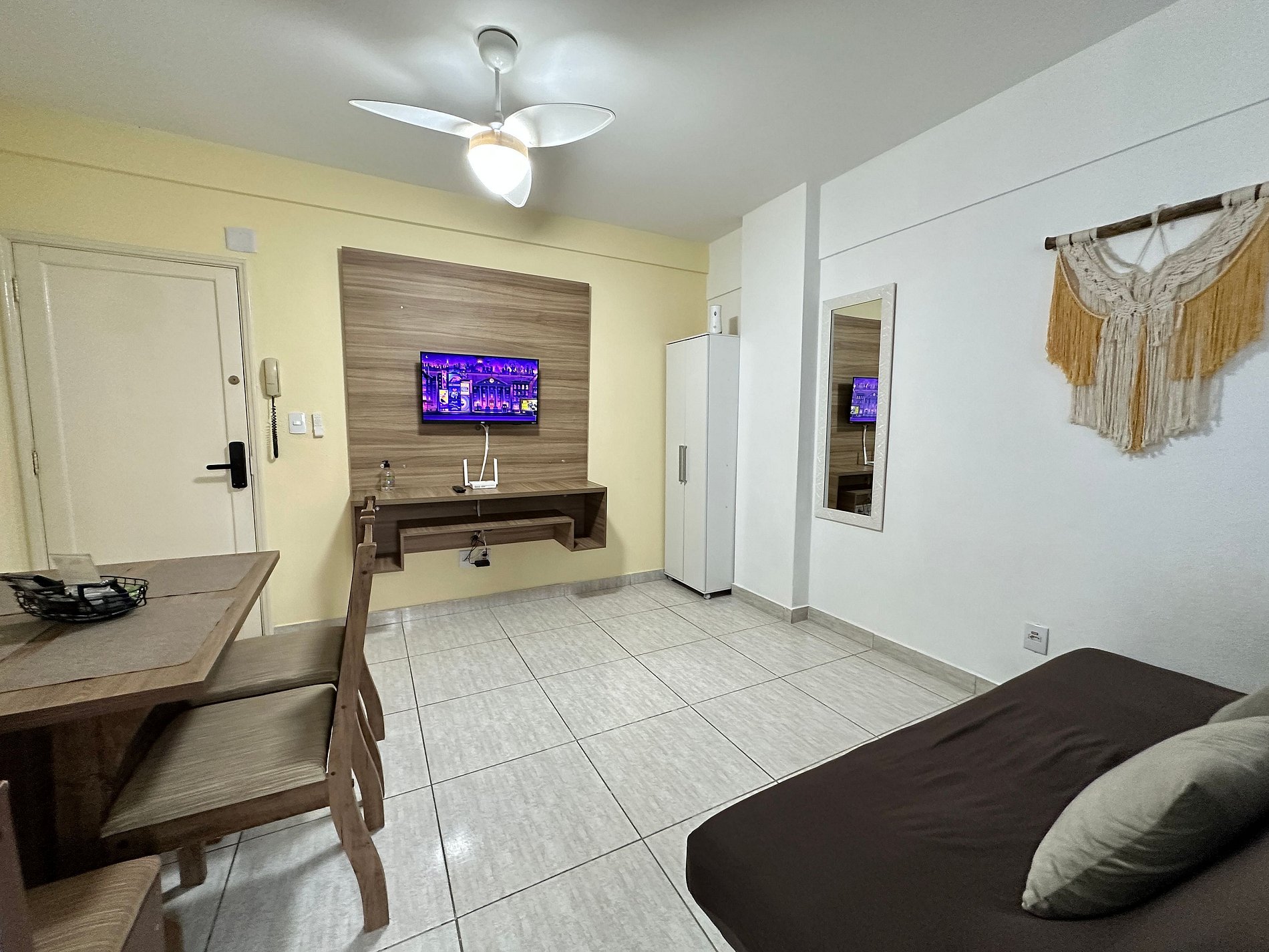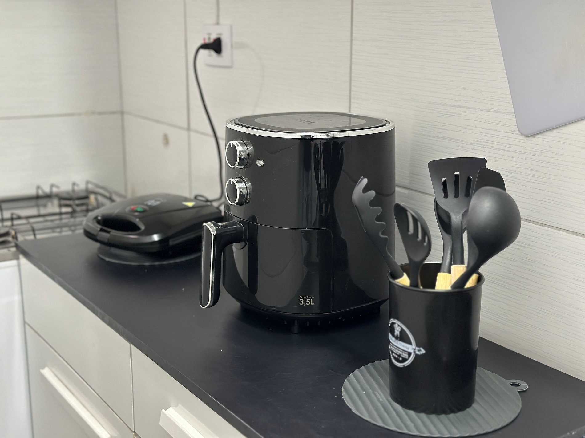 O espaço conta com Wi-Fi, ventiladores de teto, TV, cozinha completa com utensílios e eletrodomésticos (incluindo airfryer, cafeteira, sanduicheira e micro-ondas). Ambientes preparados para receber até 5 hóspedes com conforto.