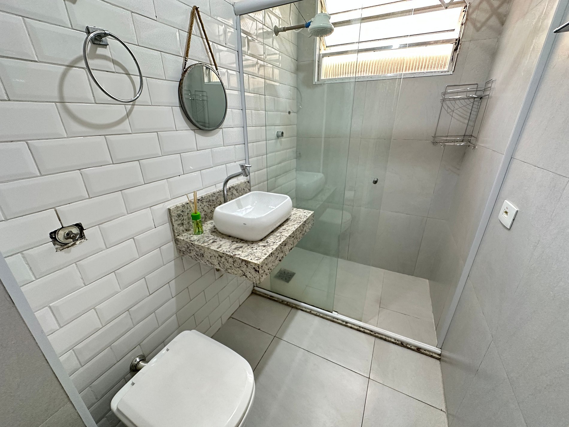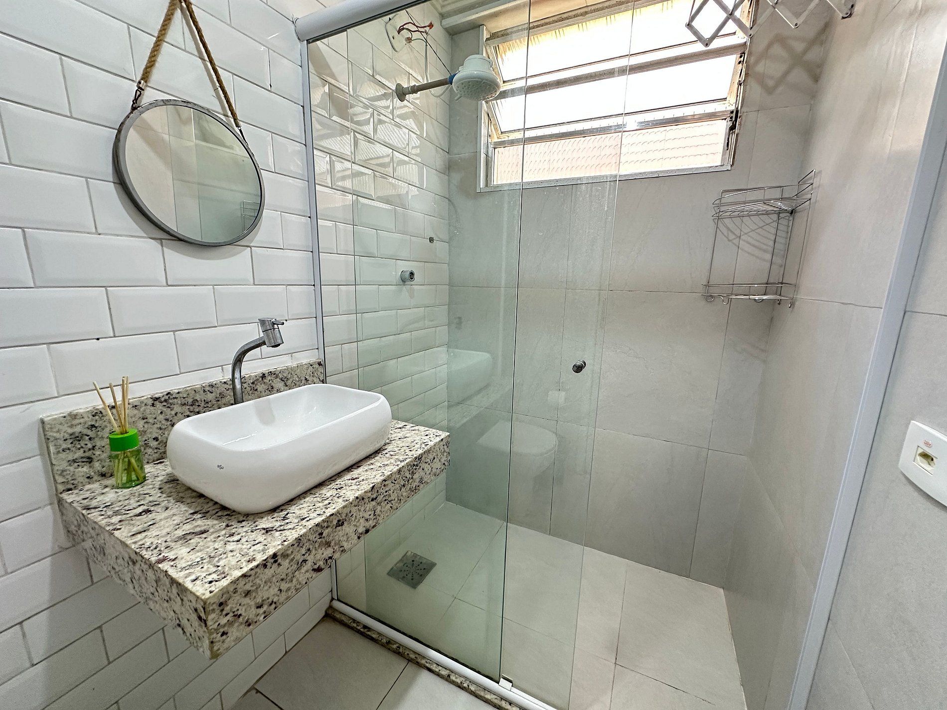 • Banheiro com box de vidro e secador de cabelo