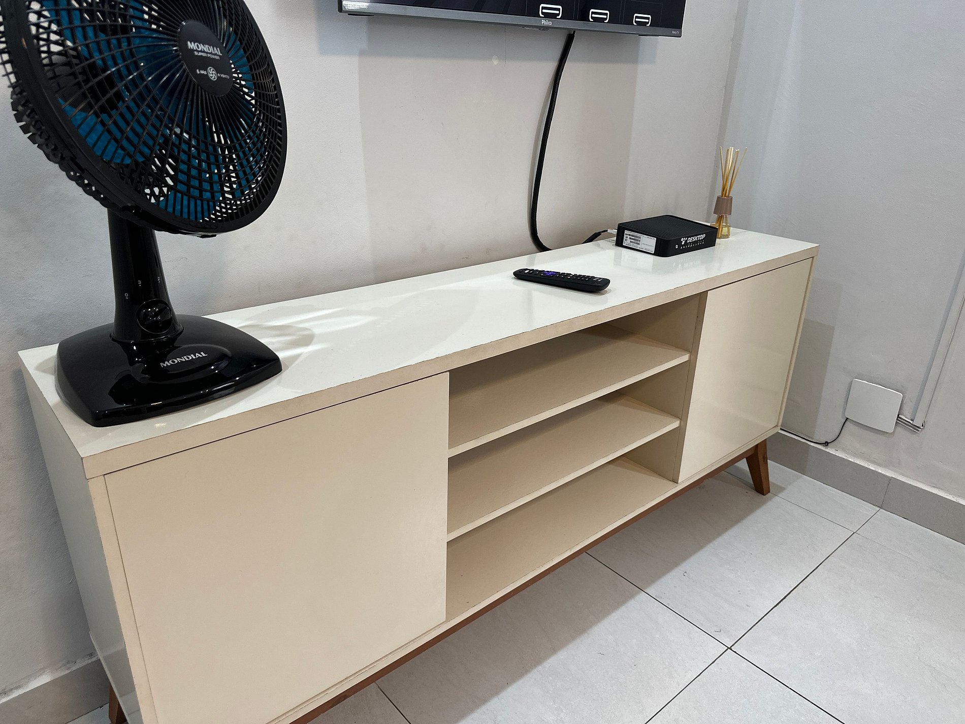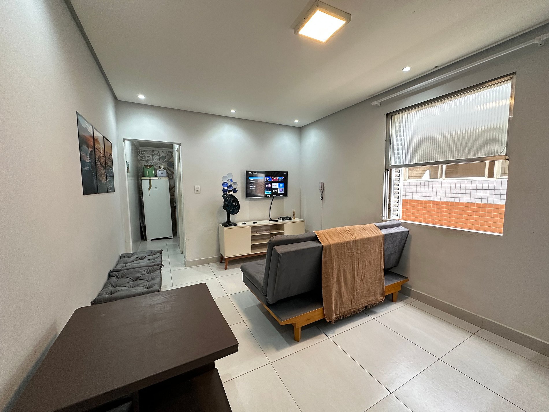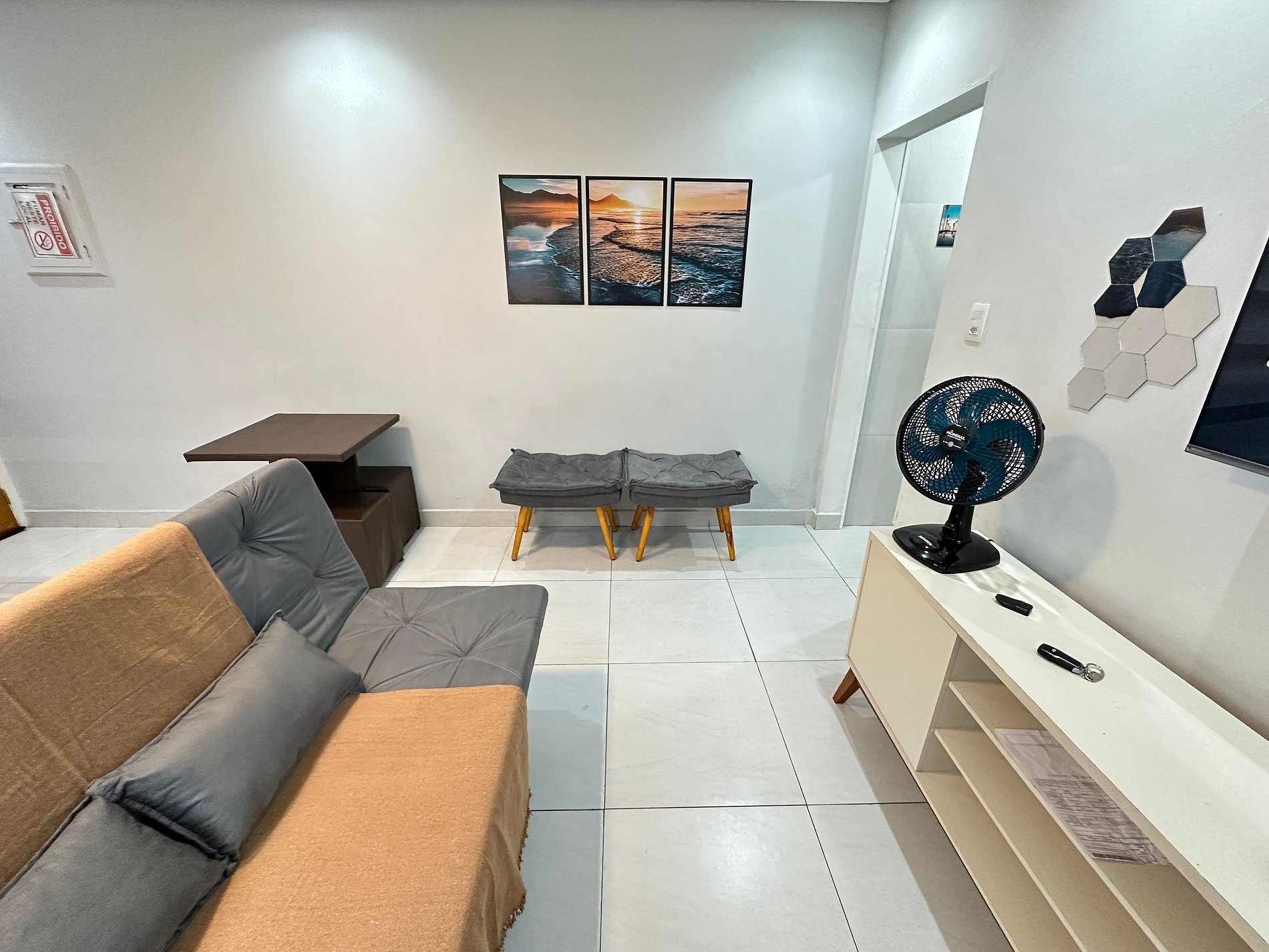 • Sala com TV, sofá-cama e ventilador