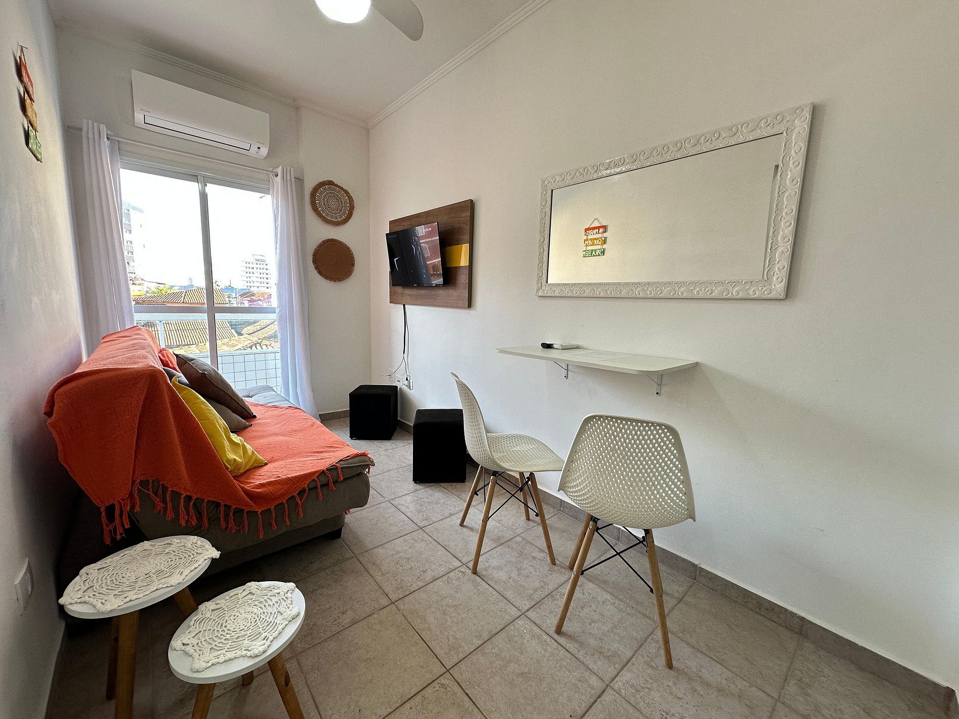 O espaço conta com ventiladores de teto na sala e no quarto, Ar condicionado, TV, cozinha completa com utensílios e um ambiente limpo e acolhedor. Ideal para quem busca descansar, trabalhar ou curtir o litoral com tranquilidade e comodidade.